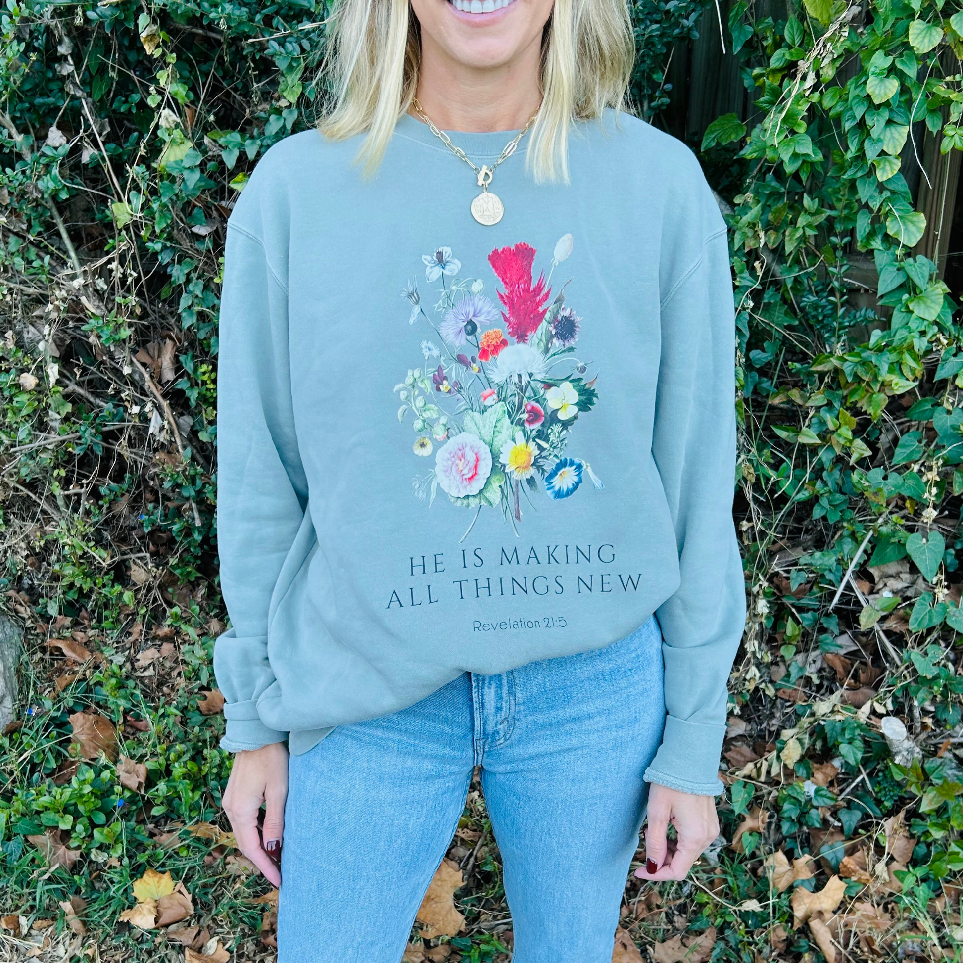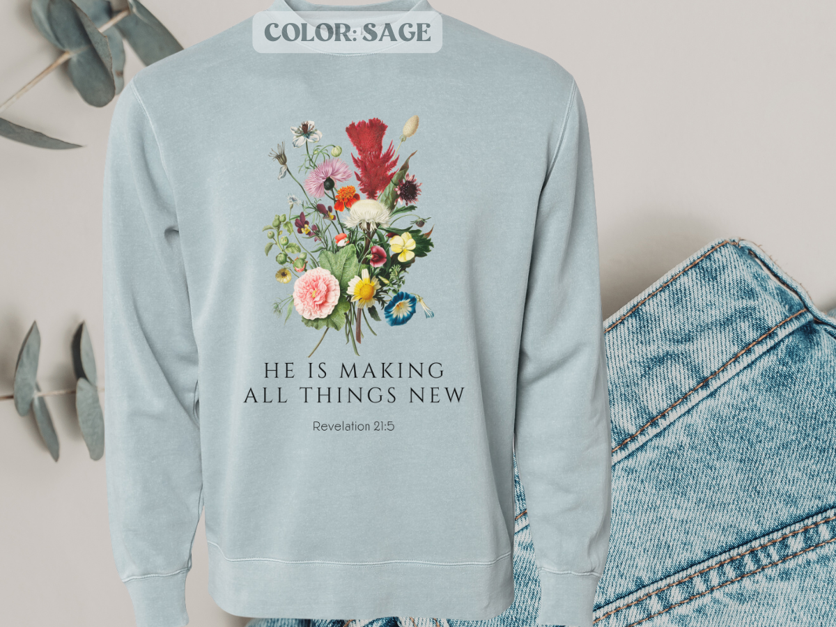 The coziest vintage feel crewneck with the sweetest reminder of Revelation 21:5